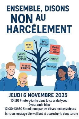 À l’occasion de la journée nationale « Non au harcèlement », le jeudi 6 novembre, notre lycée se mobilise pour rappeler l’importance de la bienveillance et du respect au quotidien.